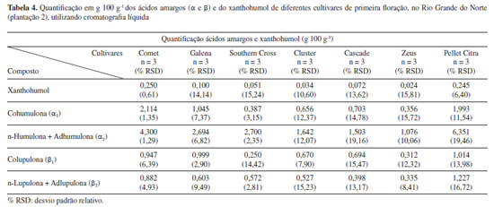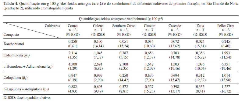 Os valores relativos à primeira floração para a cultivar Cascade, são muito similares aos valores das cultivares anteriores, segundo os quais αtotal e βtotal representam aproximadamente 30% do relatado na Tabela 2. Ao se analisar o resultado quantitativo da segunda floração, nota-se aumento no teor de αtotal (3,511 g 100 g-1), porém apenas α2 (n + adhumulona) e β1 (colupulona) apresentaram crescimento com significância estatística. Na terceira floração, verifica-se aumento na concentração de todas as substâncias em relação às floradas anteriores, sendo inclusive o teor de αtotal na amostra cultivada no Rio Grande do Norte (5,655 g 100 g-1) superior ao teor encontrado no pellet comercial (4,061 g 100 g-1), avaliado nas mesmas condições analíticas, porém contendo aproximadamente dois anos de armazenamento. Diferentes trabalhos relatam a degradação de ácidos amargos nas flores de lúpulo e de seus isomerizados na cerveja em função do tempo de estocagem, seja por suscetibilidade ao oxigênio ou ação da temperatura.33-35 A cultivar Cascade por exemplo, segundo dados do Beer Smith3®, sofre degradação de 50% dos teores de α-ácidos a cada 6 meses, se estocado a 20 ºC. Os fabricantes indicam a estocagem do lúpulo em temperaturas entre 0-5 ºC, na ausência de luz, de forma a minimizar esta degradação. No que se refere aos teores de xanthohumol, não se observa diferença estatística relevante entre todas as florações e o pellet comercial. As extrações realizadas com o dobro da massa dos pellets (1,0 g) apresentaram valores de área praticamente iguais ao dobro das extrações com 0,5 g, demonstrando que o limite de solubilização do solvente extrator não foi atingido. As proporções α1/αtotal desta cultivar foram dentro da faixa esperada (31-40%) para esta variedade em todas as florações e também no pellet comercial.28 Desta forma, evidencia-se que, com a sucessão das colheitas desta cultivar na região de plantio, o material vegetal apresentou qualidade superior à do pellet comercial, o que demonstra, em termos de concentração das substâncias de interesse, uma boa viabilidade econômica para o desenvolvimento desta cultivar nesta área de plantio. Adicionalmente, ressalta-se que as três florações foram obtidas em apenas 12 meses de cultivo, indicando a possibilidade de três safras anuais, propiciando, desta forma, maior produtividade e renda para agricultores locais. Porém, ressalta-se que o lúpulo é uma planta com ciclo de vida longo e, desta forma, os dados não permitem avaliar o efeito das três safras anuais na sua longevidade, considerando que, em grande parte das plantações, é obtida apenas uma ou duas florações anuais. A Tabela 3 também apresenta as concentrações dos ácidos amargos e do xanthohumol (g 100 g-1) para a cultivar Columbus (Monte Alegre, RN), monitorada ao longo de três florações consecutivas, porém com parte das plantas submetidas a estresse hídrico durante a produção da terceira safra. De maneira diferente da cultivar Cascade, não se percebe aumento significativo nas concentrações de ácidos amargos totais entre as florações e que mesmo na terceira floração, os valores ainda estão distantes da faixa relatada para esta variedade, que é considerada de elevado amargor (αtotal 14,0-8,0 g 100 g-1). As quantidades de xanthohumol são estatisticamente idênticas em todas as florações e até mesmo no estresse hídrico. Uma drástica redução na concentração de todas as substâncias é verificada após as plantas serem submetidas ao racionamento de água em sua terceira safra consecutiva (estresse hídrico), bem como na produtividade dos cones, demonstrando a importância da reserva hídrica necessária para a produção de flores com qualidade. Portanto, os dados indicam mais uma vez que a concentração dos compostos de interesse da indústria cervejeira (ácidos amargos) tende a aumentar ao longo da maturação das plantas e que o fornecimento de irrigação em quantidade adequada é de suma importância para que as plantas consigam produzir flores com qualidade comercial. Considerando-se que a região Nordeste possui inúmeras áreas com escassez de água, os dados apontam para o desenvolvimento de plantações apenas em locais que contenham reserva hídrica suficiente, tendo em vista que a planta necessita de quantidade significativa de água para o seu desenvolvimento, principalmente durante o processo de produção das flores, e que são necessárias florações sucessivas para se obterem cones com elevada concentração dos ácidos amargos. Segundo Souza,30 em países do hemisfério norte com clima árido e médias de temperaturas inferiores à do Brasil, o consumo hídrico da planta varia de 700 a 800 mm durante o ciclo de produção. Nakawuka et al. 36 demonstraram que o estresse hídrico de até 40% em cultivares de Willamette não provocou alteração significativa nos valores de ácidos amargos, porém reduziram a produtividade das plantas. A Tabela 4 mostra os resultados da quantificação dos ácidos amargos (α e β) e do xanthohumol para uma segunda plantação desenvolvida no município de Monte Alegre (Fazenda Varela), na qual foram implantadas novas cultivares, utilizando sistema de produção mais atualizado. Novamente foi possível observar a formação dos ácidos amargos e do xanthohumol em todas as amostras analisadas, em quantidades inferiores aos valores de referência para estas cultivares.