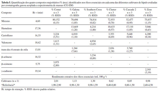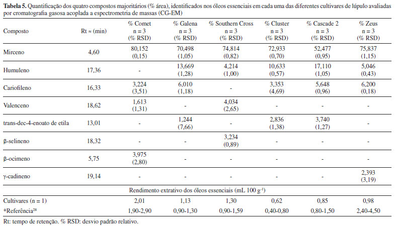 A Tabela 5 apresenta os constituintes majoritários dos óleos essenciais de cada uma das cultivares, bem como os rendimentos extrativos dos óleos (em mL 100 g-1 de flores) obtidos por hidrodestilação. É possível verificar que os quatro constituintes majoritários das seis diferentes cultivares avaliadas são representados por apenas oito substâncias distintas, indicando um perfil similar em relação às substâncias químicas majoritárias presentes. Mirceno aparece como o constituinte majoritário em todas as cultivares, em teores elevados (52,4-80,15%), o que coaduna com diferentes relatos da literatura, nos quais indicam que esta substância merece destaque, pois costuma ser o composto majoritário encontrado, chegando a constituir 60% do total do óleo, remetendo a aromas herbáceos e de lúpulo fresco.1,2,37 Humuleno e cariofileno também aparecem como constituintes em quase todas as cultivares.