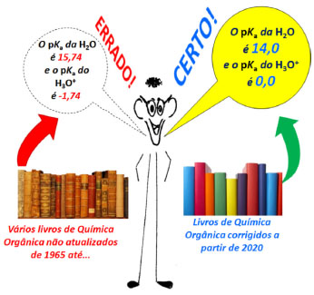 ![]() Figura 1. Valores corretos e errados do pKa da água e do cátion hidrônio presentes nos livros2,3