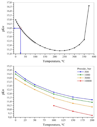 ![]() Figura 2. Variação do pKw da água pura com: (a) temperatura e; (b) em diferentes temperaturas e pressões. Dados obtidos a partir da literatura6