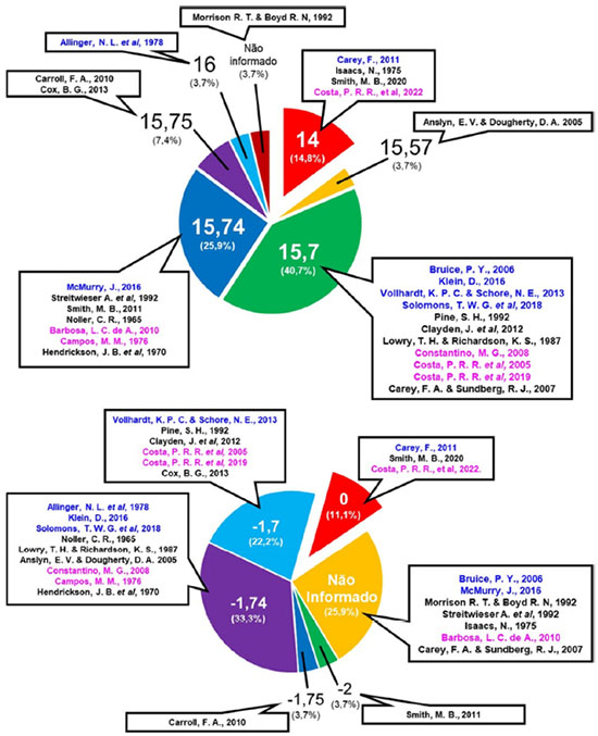 ![]() Figura 3. Valores de pKa da água (acima) e do cátion hidrônio (abaixo) nos livros de química orgânica traduzidos do inglês (azul) e empregados no Brasil, não traduzidos e empregados em cursos básicos ou avançados (preto), e nos escritos por pesquisadores no Brasil (rosa)14-42