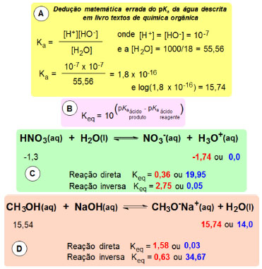 ![]() Figura 4. (a) Dedução errada do pKa da água; (b) equação para o cálculo de Keq empregando valores de pKa; (c) e (d) exemplos de conclusões desconectadas da realidade experimental quando são empregados os valores errados do pKa da água e do cátion hidrônio encontrados nos livros de química orgânica, em comparação aos valores corretos do pKa