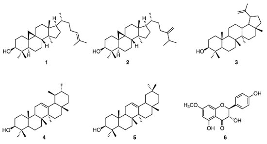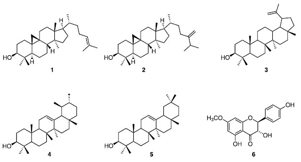 EXPERIMENTAL General procedures The solvents used in the chromatographic elutions and the preparation of all extracts were of analytical grade of the brand Quimex and Anidrol. In the chromatographic separations by CC, silica gel 60 (Aldrich) with adequate granulations of 0.063-0.200 mm or 40-63 μm were employed. UV light (254 and 366 nm) and exposure to iodine vapors were used to monitor the fractions by silica gel 60 TLC plates (F254 Merck or Supelco, 0.25 mm). The 1H and 13C nuclear magnetic resonance spectra were recorded in a Bruker equipment model Avance III-500 using CDCl3 and CD3OD as solvents and TMS as reference. The silylated chromatographic fractions were analyzed using a Shimadzu® QP2010 gas chromatography apparatus directly interfacing with mass (MS), equipped with a 5% diphenyl 95% dimethyl polysiloxane capillary column (30 m × 0.25 mm, 0.25 μm of film thickness) and helium was used as the carrier gas. Before being analyzed by GC-MS, the samples were submitted to derivatization by silylation. For this reaction, 60 μL of pyridine was added in 3 mg of the sample and, to this solution were added 100 μL of the reaction mixture of N,O-bis(trimethylsilyl)trifluoroacetamide (BSTFA) containing 1% trimethylchlorosilane (TMCS) (Aldrich). This mixture was heated in a vial to 70 ºC for 30 min, and 1 μL of the mixture was injected into the GC-MS. The injector temperature was 290 ºC. The initial temperature was set to 80 ºC for 5 min; after this period, it was increased to 285 ºC at a rate of 4 ºC min-1 and remained at the final temperature for 40 min - the temperature of the detector and the interface at 290 ºC. The mass detector operated with electron impact ionization (70 eV) and mass scanning between 30 to 600 Da. The compounds were identified by comparing the samples' mass spectra with those existing in the database of the apparatus (NIST 08, FFNSC1.3, and WILEY8). Biological material Geopropolis samples of the species M. fulva and M. compressipes were collected from hives accommodated in standardized boxes at an experimental farm located in the municipality of Macapá, AP, Brazil (0º03'04.9' 'S 51º06'44.3''W) in june 2022. The sample of geopropolis from M. paraensis was kindly provided in june 2022 by meliponiculturist, who collected it in the same conditions as the above sample but in the municipality of Santana, AP, Brazil (0º22'46.9''N 51º25'48.6''W) Extraction and isolation of the chemical constituents Samples of geopropolis of M. fulva (200 g),M. compressipes (200 g), and M. paraensis (240 g) were manually powdered and subsequently submitted to extraction by cold maceration using hexane (1 L) as an extracting solvent for 48 h for 3× consecutively. The filtrate obtained in each step was concentrated under reduced pressure furnishing the hexane extracts of the three geopropolis M. fulva (356 mg), M. compressipes (1.011 g), and M. paraensis (1.969 g). The same extraction procedure was repeated using MeOH (1 L) as the extracting solvent and furnished the MeOH extracts of geopropolis M. fulva (1.313 g), M. compressipes (958 mg), and M. paraensis (6.049 g). The MeOH extract of geopropolis from M. paraensis was sequentially dissolved in MeOH/H2O (7:3) and partitioned between CHCl3 to give the CHCl3 soluble fraction (2.74 g). This fraction was submitted to a silica gel 60 CC and eluted with mixtures of CHCl3:MeOH in a polarity gradient. The chromatographic fractions (17 fractions of 50 mL each) were analyzed by TLC. Similar ones were joined, totaling 13 subfractions with similar TLC profiles. The fraction 5 (20 mg), eluted with CHCl3:MeOH (95:05), was identified as a mixture and was composed of cycloartenol (1), 24-methylene-cycloartenol (2), lupeol (3), α-amirin (4) and β-amirin (5). The fraction 12 (25 mg) eluted with CHCl3:MeOH (9:1) was purified by treatment with pure CHCl3 furnishing a white precipitate identified as (2R,3R)-3,4',5-trihydroxy-7-methoxyflavanone (6). In the other chromatographic fractions, pure compounds could not be obtained due to the problematic separation of the constituents. Antibacterial activity The Streptococcus mutans (ATCC 700610) and S. sobrinus (6715) strains used in the antimicrobial tests were obtained from the Department of Pharmacology, Anesthesiology and Therapeutics of the School of Dentistry of UNICAMP (Campinas, SP, Brazil). The strain of Streptococcus mutans ATCC 25175 was provided by the National Institute of Quality Control in Health (INCQS) - Fundação Oswaldo Cruz - FIOCRUZ (Rio de Janeiro, Brazil). The strains were incubated for 24 h at 37 ºC and 5% CO2 in BHI broth with 1% glucose. The microorganisms Staphylococcus aureus ATCC 43300 INCQS 00306 (resistant to amoxicillin) and clinical isolates of S. aureus 16A, 112, 92, and 29, collected from two public hospitals in the city of Vitória da Conquista, Bahia, Brazil, were also incubated for 24 h at 37 ºC in BHI broth. The antimicrobial activity was determined by minimum inhibitory concentration (MIC) and minimum bactericidal concentration (MBC). Briefly, for MIC determination, the starting inoculum of the above microorganisms was 1-2 × 108 CFU mL-1 (McFarland scale), and 10 μL of hexane and MeOH extracts of M. fulva,M. compressipes, and M. paraensis geopropolis, with final concentrations ranging from 1000 to 31.25 μg mL-1 with serial dilution by a ratio of 2. This test was performed in 96 wells microplates, in which each well was filled with 190 μL BHI with inoculum (inoculation 1:1000), except the negative control wells. The plates were incubated for 24 h at 37 ºC and 5% CO2.18 After incubation, the growth evaluation was visually observed by turbidity of the medium and/or the presence of colonies at the bottom of the wells. For those wells with no visual growth, 20 μL of 0.01% resazurin (Sigma) were added. After 20 min of incubation with resazurin, blue indicated the absence of growth, and pink color, bacterial growth.19 MIC was defined as the lowest fraction c
