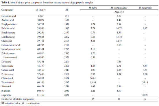 RESULTS AND DISCUSSION The composition of the hexane extracts of the different geopropolis was tentatively performed by GC-MS (Table 1). The total ion chromatograms obtained were complex, and the identified substances were previously submitted to silylation for the complete volatilization of the chemical content. The samples of geopropolis M.fulva and M. compressipes, collected in the same region, showed similar peaks in the chromatograms' 35.0 to 65.0 min, although with different relative proportions. The sample of M. paraensis geopropolis, collected in a different spot, presented a completely distinct chromatographic profile.