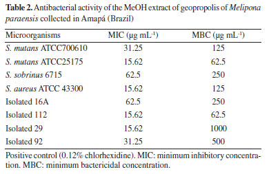 CONCLUSIONS The present study deals with the chemical composition of geopropolis collected in Amapá from Melipona fulva,M. compressipes, and M. paraensis. The geopropolis collected in different regions presented a distinct chemical composition referring to non-polar compounds. The geopropolis of M. paraensis showed that it has bioactive compounds of the class of flavonoids and triterpenes; the methanolic extract also demonstrated excellent antibacterial activity. Besides, some triterpenes and 7-O-methylaromadendrin were isolated for the first time in this geopropolis. These results suggest profound studies with these types of geopropolis from the Amazon since bee products are widely used in the region.