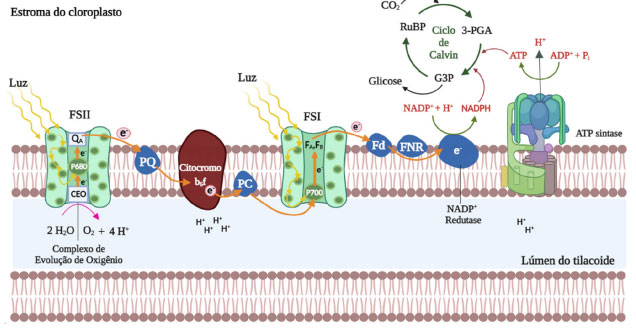 Figura 2. Representação do esquema de transferência de elétrons na fase luminosa da fotossíntese com produção de ATP e NADPH utilizados no ciclo de Calvin (fixação do CO2)