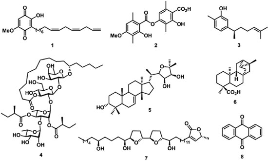 ATIVIDADE ALELOPÁTICA DE PRODUTOS NATURAIS NO FOTOSSISTEMA II Compostos aleloquímicos são substâncias produzidas e liberadas por organismos vivos, as quais possuem efeitos de indução ou inibição do desenvolvimento de organismos alvo.43,44 Neste contexto, os aleloquímicos podem ser metabólitos secundários liberados de maneira volátil ou extraídos das plantas, com o papel de induzir o crescimento ou inibir a sobrevivência de outra planta.45-48 Estudos envolvendo a atividade aleloquímica de inibição da fotossíntese despertam o interesse de pesquisadores diante da necessidade do desenvolvimento de produtos ambientalmente sustentáveis. Produtos naturais inibidores da fotossíntese têm recebido destaque diante do uso continuado de herbicidas sintéticos, o que leva ao desenvolvimento de plantas invasoras resistentes a esses defensivos agrícolas, além da toxicidade provocada aos seres humanos e ao meio ambiente.49-51 Nesse contexto, compostos aleloquímicos, por serem de origem natural e apresentarem diferentes mecanismos de ação, estão sendo estudados na inibição do transporte de elétrons do FSII como uma ferramenta importante na compreensão do processo fotoquímico de plantas, algas e cianobactérias.52-55 Os primeiros relatos do estudo de efeitos fitotóxicos com aleloquímicos relacionados a medidas de fluorescência da Chl a e atividades fotossintéticas foram descritos no final do século XX. A sorgoleona (1), um derivado de p-benzoquinonas, foi descrita como um inibidor da evolução fotossintética de plantas a baixa concentração (10 µmol L-1), e uma diminuição da eficiência fotossintética (FV/FM) foi observada como parâmetro de medida de fluorecência.56 Nos anos seguintes, o composto 1 e derivados foram estudados como inibidores do transporte de elétrons no FSII.57,58 Outros metabólitos secundários, como o ácido barbático (2),59 xantorrizol (3),60 tricolorina A (4),61 odoratol (5),62 ácido traciloban-19-oico (6),63 esquamocina (7)64 e antraquinona (8)65 foram analisados e seus efeitos como inibidores do transporte de elétrons no FSII confirmados em concentrações de 10 µmol L-1 a 200 µmol L-1 (Figura 4). Todas as substâncias apresentaram uma redução da taxa fotossintética demonstrada pelos parâmetros de fluorescência da Chl a como F0, FM, FV/FM, e para algumas substâncias foi observado o surgimento da banda J na curva polifásica transiente OJIP, indicando efeitos no lado aceptor de elétrons do FSII.