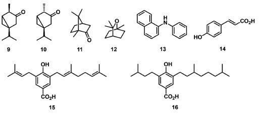 ![]() Figura 5. Monoterpenos e compostos aromáticos inibidores do transporte de elétrons no FSII