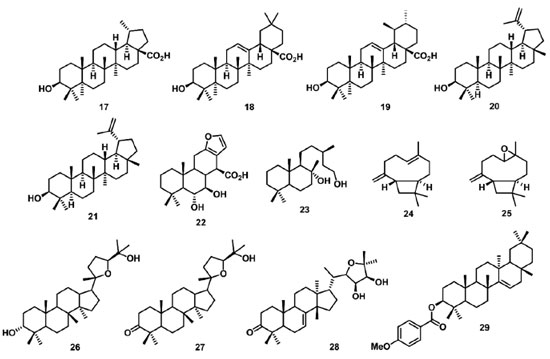 O composto N-fenil-1-naftilamina (13) foi utilizado como aleloquímico na inibição do crescimento e da atividade fisiológica de M. aeruginosa em um padrão de exposição repetida de baixa dosagem (50 mg L-1), simulando a liberação contínua de aleloquímicos realizada pelas plantas. O composto 13 reduziu a eficiência quântica do FSII em dependência do tempo, observadas para esse parâmetro porcentagens de 78% e 10% no segundo e nono dia do experimento, respectivamente.73 O ácido p-cumárico (14) foi reportado com potencial efeito inibitório na atividade fotossintética, no controle do crescimento vegetal da espécie Panax quinquefolium, o ginseng americano. Dentre os parâmetros fotossintéticos avaliados neste trabalho, o composto 14 na concentração de 0,06 mg L-1 reduziu os parâmetros relacionados a taxa fotossintética e transporte de elétrons em 64% e 41%, respectivamente.74 Outros compostos ácidos avaliados como inibidores da fotossíntese em experimento in vitro, foram o ácido myrsinoico A (15) e seu derivado (16), ambos isolados da Myrsine cuneifolia. Esses compostos reduziram os parâmetros fotossintéticos no FSII, diminuindo a absorção de fótons pelo complexo antena e o aprisionamento de elétrons pelos RCs, assim impedindo a redução de P680+, e consequentemente gerando um acúmulo de elétrons P680+, Pheo+ e QA-.75 Os triterpenos pentacíclicos ácidos betulínico (17), oleanólico (18) e ursólico (19) (Figura 6), isolados a partir de extratos aquosos e metanólicos de Alstonia scholaris, foram avaliados como inibidores do crescimento vegetal de plantas daninhas. Os parâmetros relacionados a máxima eficiência quântica do FSII (Fv/FM), fluorescência inicial (F0), fluorescência máxima (FM), e a taxa de transporte de elétrons (ETR) foram usados para avaliação do crescimento vegetal. Nesse estudo, os compostos 17 e 19 na concentração de 2 mmol L-1 reduziram o parâmetro ETR em 40% e 30%, respectivamente.76 Outros triterpenos como o lupeol (20) e acetato de 3β-lup-20(29)-en-3-il (21) (Figura 6), foram isolados de Maytenus acanthophylla Reissek e avaliados na inibição da fotossíntese. Destes compostos, o 20 demonstrou os melhores resultados na concentração de 300 µmol L-1, aumentando em 30% os valores dos parâmetros ABS/RC e TR0/RC, e reduzindo o parâmetro RC/CS0 em 20%. No entanto, o composto 20 não promoveu alterações significativas nos parâmetros TR0/CS0, ET0/RC, PHI(D0), PHI(P0) e ET0/CS, sugerindo uma porcentagem do fluxo de energia sendo dissipada como calor. Portanto, o composto 20 inibe parcialmente a enzima de separação de água e também interage com os RCs do FSII, modificando a estrutura da membrana do tilacoide e afetando suas propriedades de migração de energia.77