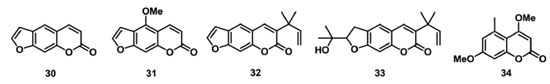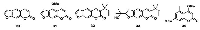 O diterpeno ácido 6α,7β-diidroxivouacapan-17β-oico (22) (Figura 6), isolado de Pterodon polygalaeflorus, e seus derivados sintéticos foram avaliados como inibidores do transporte de elétrons do FSII em concentrações de 50 µmol L-1 a 300 µmol L-1. Foi observada a redução dos parâmetros relacionados ao índice de desempenho PIabs, aos RCs (ABS/RC e ET0/RC) e por CS (ABS/CS0, TR0/CS e ET0/CS), indicando que a cadeia transportadora de elétrons do FSII foi afetada, assim como foi observado o surgimento da banda K em 300 µs, demonstrando um desequilíbrio entre os lados doador e aceptor de elétrons do FSII.78,79 Outro diterpeno, o labdano-8α,15-diol (23) (Figura 6), isolado de Croton ciliatoglanduliferus, reduziu o parâmetro φPo em 0,012 unidades nas concentrações de 300 μmol L-1 e 600 μmol L-1 em comparação ao controle. Esse resultado indica que QA- não é acumulada quando o FSII é inibido pelo aleloquímico. Os decréscimos observados no tamanho do complexo antena por RC (ABS/RC), no transporte de elétrons por RC, M0 e FM, sugerem que o 23 afeta mais o lado doador de elétrons do FSII que os centros reacionais.80 Os sesquiterpenos β-cariofileno (24) e óxido de cariofileno (25) (Figura 6), isolados de Senecio salignus, foram avaliados como inibidores fotossintéticos em experimentos de fluorescência da Chl a na concentração de 100 µg L-1. O composto 24 reduziu os parâmetros ET0/CS, PHI(P0), PSI0, RC/CS0, TR0/CS e ET0/CS em 50%, e aumentou em 20% os valores dos parâmetros dV/dt0, ABS/RC e TR0/RC. Esses resultados sugerem que os RCs do FSII foram transformados em dissipadores de calor ou centros de reação silenciosos, pois esses RCs não podem reduzir a QA e sua energia de excitação é dissipada na forma de calor.81 Os triterpenos cabraleadiol (26), ocotilona (27) e odoratona (28) isolados de Cabralea canjerana Mart. , e 4-metóxibenzoato de traxerol (29) (Figura 6) isolado Pavonia multiflora A. St-Hil. , foram avaliados em experimentos in vitro como inibidores da fotossíntese. Os dados de fluorescência da Chl a mostram que 27 e 28 inibem parcialmente a enzima de quebra da molécula de água, e agem no transporte de elétrons de P680 a QA, com ação no lado doador do FSII e no complexo OEC.17 O composto 29 promoveu um aumento da intensidade da fluorescência entre 2 ms e 4 ms, indicando o surgimento da banda J, a qual fornece informações sobre reações fotoquímicas primárias, em especial, referente a redução de QA. Isso indica que o transporte de elétrons além de QA é bloqueado no nível QB, um aceptor de elétrons de quinona secundária de FSII.82 Os terpenos 22-29 têm ação aleloquímica em toda cadeia transportadora de elétrons do FSII. Estes compostos bloqueiam o transporte dos elétrons, resultando no aparecimento das bandas transientes K e J, o que indica o desequilíbrio no fluxo eletrônico nos lados doadores e aceptores de elétrons do FSII. Pontanto, os terpenoides atuam no complexo enzimático responsável pela quebra da molécula de água no centro de reação silencioso incapacitando a redução de QA, e também têm ação no intervalo P680+, Pheo e QA-QB, inibindo o processo redox no pool das quinonas. Cumarinas também são uma classe de metabólitos secundários com atividade alelopática no FSII. Sampaio et al. 83 descreveram o estudo de 4 furanocumarinas isoladas da Ruta graveolens, psoraleno (30), bergapteno (31), chalepensina (32) e chalepina (33) (Figura 7) como inibidores da cadeia transportadora de elétrons do FSII. Dos compostos avaliados, 31 e 33 apresentaram os melhores resultados na concentração de 300 µmol L-1, ambos os compostos reduzindo o parâmetro PIabs em 60%, comparado com o controle. Outros parâmetros que sofreram redução foram ET0/CS0, TR0/CS0, RC/CS0, PSI0 e PHI(E0), demonstrando que a energia absorvida nessas seções e o transporte de elétrons foram limitados. A presença dos compostos 31 e 33 levou ao surgimento da banda J na curva transiente de fluorescência, indicando a ação das furanocumarinas no lado aceptor de elétrons do FSII. A siderina (34) (Figura 7), uma cumarina isolada do extrato metanólico de Toona ciliata, foi avaliada no experimento de fluorescência da Chl a, demonstrando uma redução dos parâmetros ΦP0 e ET0/RC, o que indica um decréscimo no rendimento quântico máximo da fotoquímica primária, e a redução da taxa de transporte de elétrons além da QA-. Também foi observada a redução de FM e valores constantes para F0, indicando a formação de centros de reação silenciosos, o que sugere que 34 atua como um inibidor dos lados doador e aceptor de elétrons entre P680 e QA.84