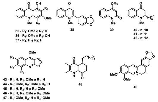Sampaio et al. 85 descreveram o isolamento de alcaloides (35-42) (Figura 8) do extrato etanólico de R. graveolens e a avaliação como inibidores da fotossíntese. Dos alcaloides estudados, o composto graveolina (38) apresentou os melhores resultados, aumentando dV/dt0 e diminuindo PIabs ambos em 60% na concentração de 150 μmol L-1. A associação destes resultados com a redução de PSI0, PHI(E0), SM, ET0/CS0, e ET0/RC em 40%, demonstra que o transporte de elétrons no processo redox das quinonas foi interrompido, indicando danos ao FSII. Nesse contexto, Veiga et al. 86 descreveram o estudo de alcaloides furoquinolínicos (43-47) (Figura 8) isolados do extrato diclorometano de Balfourodendron riedelianum, empregando a fluorescência da Chl a e o JIP-test. O composto evolitrina (43) mostrou os melhores resultados com o aumento de δRo e jRo em 60% na concentração de 400 µmol L-1, comparado ao controle. Além desses resultados, houve um aumento do rendimento quântico para a redução de aceptores finais do FSI por fóton absorvido, sugerindo que os aceptores finais do FSI não podem ser reduzidos porque os elétrons do FSII não estão sendo transferidos. Portanto, a evolitrina demonstra efeito inibidor nos lados doador e aceptor de elétrons do FSII.