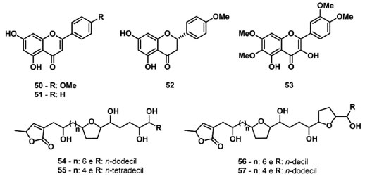 A antidesmona (48) (Figura 8), um alcaloide isolado de Waltheria brachyepetala, possui características químicas estruturais semelhantes a plastoquinona, e demostrou ser um inibidor das reações de Hill, bloqueando o fluxo de elétrons no lado aceptor de elétrons do FSII, efeito semelhante ao encontrado para o herbicida comercial Diuron. Esses resultados foram evidenciados pela redução dos parâmetros ψ0, jE0, Sum K, KP, ET0/RC e PIabs em 21%, 24%, 12%, 16%, 17% e 52%, respectivamente, na concentração de 300 μmol L-1, indicando o acúmulo de QA- devido ao bloqueio da passagem dos elétrons para QB.87 O alcaloide berberina (49) (Figura 8), presente em plantas das famílias Annonaceae, Berberidaceae, Menispermaceae, Papaveraceae, Ranunculaceae e Rutaceae,88 levou a reduções significativas na cadeia transportadora de elétrons do FSII da alga M. aeruginosa, diminuindo os parâmetros Fv/FM e ETR em 28% e 57%, respectivamente, na concentração de 0,47 mg L-1.89 Dentre os parâmetros de fluorescência da Chl a avaliados na atividade aleloquímica das cumarinas 30-33 e dos alcaloides 34-49, é possível identificar uma correlação na redução dos parâmetros relacionados ao índice de desempenho e transferência de elétrons, indicando um mesmo sítio de ação para essas duas classes de metabólitos secundários. King-Díaz et al. 90 descreveram os efeitos dos flavonoides acacetina (50), crisina (51) e 4',7-dimetilnaringenina (52) (Figura 9) nas reações da fase luminosa da fotossíntese. Os dados de fluorescência da Chl a demonstraram que os flavonoides 51 e 52 reduzem o parâmetro FV/FM e promovem o surgimento da banda J, indicando a inibição no lado aceptor de elétrons do FSII. O flavonoide 3,5-dihidroxi-6,7,3',4'-tetrametóxiflavunol (53) (Figura 9), isolado a partir de Pluchea sagittalis foi descrito por Carvalho et al. 91 como um inibidor fotossintético. A análise dos dados obtidos indica que 53 ocupa a posição do aceptor secundário de quinona (QB) do sítio de ligação da proteína D1 do FSII, e o aumento da fluorescência ocorre principalmente pelo estado redox de QA-, indicando que 53 interage no lado aceptor de elétrons do FSII. As acetogeninas glaucafilina (54), gigantetrocina (55), cherimolina (56) e gigantecina (57) (Figura 9), isoladas das folhas de Annona coriacea Mart. , demonstraram atividade na inibição do fluxo de elétrons do FSII nas concentrações de 300 μg mL-1 e 600 μg mL-1, reduzindo o parâmetro PIabs em 15% e 25%, respectivamente. A mistura contendo os compostos 54-57 também levou a redução de ET0/CS0 e da área normalizada abaixo da curva OJIP, indicando que as acetogeninas inibem o fluxo de elétrons do FSII.92 Nos dados de fluorescência da Chl a obtidos para os flavonoides e as acetogininas, foi possível identificar a presença da banda J, indicando um evento de rotatividade das reações primárias, principalmente, o que demonstra o bloqueio do transporte de elétrons entre QA e QB.