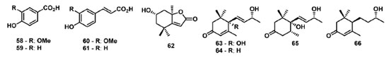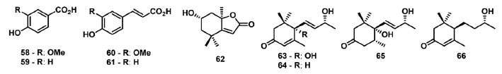 Lopes et al. 82 descreveram o isolamento e avaliação da atividade fotossintética dos derivados fenólicos: ácidos vanilíco (58), ferúlico (59), p-hidróxibenzoico (60) e p-cumárico (61); e dos norisoprenoides: loliolide (62), vomifoliol (63), 3-oxo-α-ionol (64), 4,5-dihidroblumenol A (65) e blumenol C (66) (Figura 10). Dos metabólitos avaliados, o composto 62 mostrou os melhores resultados, reduzindo os parâmetros relacionados a CS0, ET0/CS0, RC/CS0 e TR0/CS0 em aproximadamente 90%, e PHI(P0) foi reduzido em 30%. Estas informações sugerem que alguns RCs do FSII foram transformados em centros de reação silenciosos, os quais não reduzem a QA e sua energia de excitação é dissipada na forma de calor.