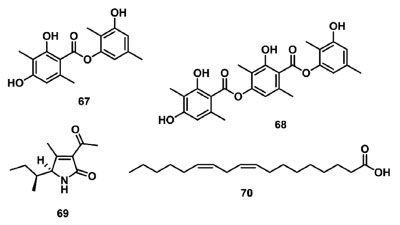 Além dos extratos e substâncias isoladas de plantas, os microrganismos têm demonstrado ser uma fonte promissora na descoberta de novos compostos com ação alelopática na inibição da fotossíntese. Moura et al. 93 reportaram o uso de extratos metanólicos dos fungos endofíticos Diaporthe phaseolorum,Penicillium simplicissimum e Trichoderma spirale na inibição da fotossíntese e do crescimento vegetal de Senna occidentalis e Ipomoea grandifolia. O fungo T. spirale mostrou os melhores resultados frente a S. occidentalis, reduzindo os parâmetros PIabs, ET0/CS0, PHI(E0) e PSI0 em 64%, 28%, 40% e 38%, respectivamente, indicando a inibição do transporte de elétrons no lado aceptor do FSII. Os fungos endofíticos também representam fontes naturais de metabólitos secundários para a atividade alelopática inibitória da fotossíntese, por exemplo, Medeiros et al. 94 reportaram a avaliação dos efeitos na fluorescência da Chl a provocados por depsídeos (67 e 68) (Figura 11) produzidos pelo fungo Cladosparium uredinicola. Os resultados obtidos mostram que 67 e 68 inibem o transporte de elétrons nos lados doador e aceptor de elétrons do FSII, na concentração de 300 µmol L-1. O ácido tenuazônico (69) (Figura 11), um metabólito secundário isolado a partir do extrato etanólico de Alternaria alternata, foi avaliado na inibição do FSII. Os dados de fluorescência da Chl a mostraram que 69 interrompe o transporte de elétrons entre QA e QB no lado aceptor do FSII, com um valor de I50 de 48 μg mL-1. O bloqueio da transferência de elétrons foi evidenciado pelo acúmulo de QA-, observado pelo aumento de F0 e FM, e um decréscimo dos parâmetros ET0/RC, ET0/CSM, jEo e ψ0.95
