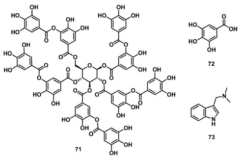 Em outro trabalho envolvendo metabólitos secundários isolados de microrganismos, Quian et al. 96 realizaram o estudo da atividade alelopática do ácido linoleico (70) (Figura 11) na inibição da fotossíntese da alga Chlorella pyrenoidosa. O parâmetro FV/FM foi utilizado como indicador da inibição do FSII, e após o tratamento com 70 em concentrações de 60 μg L-1 a 120 μg L-1, FV/FM foi reduzido de 20,5% a 34,1%, demonstrando um decréscimo no rendimento quântico máximo do FSII. Ye et al. 97 reportaram o uso do JIP-test como ferramenta de análise da atividade alelopática da macroalga Gracilaria lemaneiformis no controle da microalga Chaetoceros curvisetus. A inibição do FSII foi identificada pela redução dos parâmetros FV/FM, RC/CS0, RC/CSM, ABS/CS0 e ψ0, indicando que a G. lemaneiformis reduz o número de RCs ativos, danificando a cadeia de transportadora de elétrons e comprometendo o funcionamento do complexo de evolução de oxigênio de C. curvisetus. Outro estudo de alelopatia empregando macro e microalgas foi realizado por Ma et al. ,98 onde foi avaliado o uso do extrato diclorometano:metanol (3:1, v/v) de Prorocentrum donghaiense na inibição da fotossíntese de Sargassum fusiformis. Os resultados obtidos no JIP-test demonstraram uma redução dos parâmetros VJ, M0, ϕPo, ϕ0, ϕEo e PI, e aumento de DI0/RC, indicando danos aos aceptores de elétrons, a inativação dos RCs e bloqueio do transporte de elétrons. A fluorescência da Chl a também tem sido empregada na avaliação das interações alelopáticas existentes entre as macroalgas Ulva linza e Gracilaria lemaneiformis. Neste estudo, os resultados obtidos demonstram que a alga U. linza afeta o crescimento e a fotossíntese de G. lemaneiformis, sendo a eficiência fotossintética reduzida em 27,2%, 39,2%, e 84,7% nas concentrações de 1,25 g L-1, 3,75 g L-1 e 6,25 g L-1, respectivamente.99 Laue et al. 100 reportaram os efeitos dos xenobióticos ácido tânico (71), ácido gálico (72) e gramina (73) (Figura 12) nas taxas de crescimento, volume celular, rendimento quântico máximo do FSII (ΦFSIImáx = FV/FM) das algas Desmodesmus armatus e M. aeruginosa. Os resultados demonstraram que os xenobióticos reduziram o parâmetro ΦFSIImáx depois de 2 dias de tratamento, tendo efeitos mais significativos na alga M. aeruginosa com a presença dos polifenóis que em D. armatus.