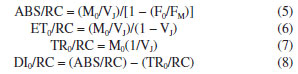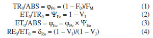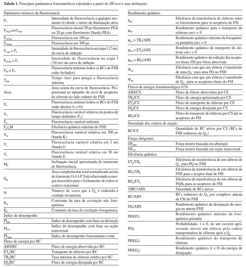 Os parâmetros fotossintéticos descritos na Tabela 1 são calculados a partir das informações primárias obtidas com as análises da fluorescência da Chl a. Por exemplo, os parâmetros de rendimento quântico são calculados utilizando as seguintes fórmulas: ![]() Os parâmetros relacionados aos fluxos específicos por centro reacional utilizam as fórmulas: ![]() Estes e outros parâmetros de fluorescência da Chl a podem ser obtidos utilizando o programa Biolyser HP3 (Bioenergetics Laboratory, Universidade de Geneva, Suíça). Este programa utiliza a planilha de dados registrados pelo fluorímetro Handy Pea (Hansatech Instruments Ltd. , Reino Unido) para calcular automaticamente todos os parâmetros da curva OJIP, em função de quatro fenômenos principais que ocorrem durante a fluorescência da Chl a: fenomenológicos, específicos, rendimentos quânticos e índices de desempenho.