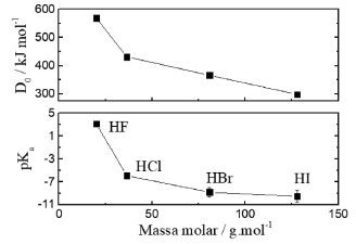Figura 1. Comparativo entre a energia de ligação e o pKa de hidrácidos dos halogênios (fonte: obra do autor; dados de pKa extraídos de Dean)29