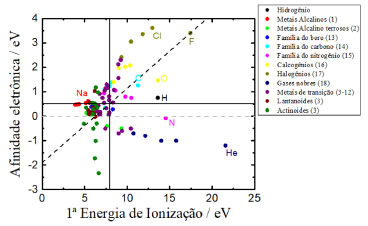 Figura 2. Relação entre a energia de ionização e a afinidade eletrônica. As linhas cheias, horizontal e vertical, representam os valores médios da afinidade eletrônica (AE) e da 1ª energia de ionização (EI) dos elementos da tabela periódica. A linha tracejada representa a equação (fonte: obra do autor; dados extraídos de Haynes et al.)8