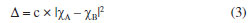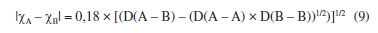 Desse modo, Pauling associou ao Δ introduzido o módulo da diferença ao quadrado da eletronegatividade, à qual é representada pele letra grega "chi" χ, dos elementos genéricos A e B (|χA - χB|2)junto a uma constante de proporcionalidade (c) como visto na Equação 3, afinal as discrepâncias da propriedade intrínseca eletronegatividade dos elementos químicos resultavam nas diferentes contribuições iônicas sob as ligações covalentes dando-lhes valores experimentais maiores que o esperado.6 Dessa maneira, os valores de ∆ serviram como base da criação da escala de eletronegatividade.6