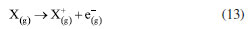 A energia de ionização depende da carga nuclear efetiva e da estabilidade adquirida pelo elemento para formação do cátion.10 Essa propriedade é definida como a energia mínima necessária para remoção de um elétron de um sistema atômico (átomo ou íon monoatômico) gasoso, isolado e no estado fundamental, sendo representada pela Equação 13 ao considerar a primeira energia de ionização de um átomo neutro (X).8