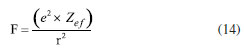 Em 1958, Albert Allred e Eugene Rochow11 propuseram uma escala de eletronegatividade baseada na força de atração nuclear entre o núcleo e o elétron. As cargas elétricas são tratadas como cargas pontuais para estimar a força de atração (F) exercida pelo núcleo em relação ao elétron por uma distância equivalente ao raio covalente (r), (e) é a carga do elétron e Zef representa a carga experimentada pelo elétron a partir da interação com o núcleo - a carga nuclear efetiva,11 sendo menor que a carga nuclear real por conta das repulsões elétron-elétron que promovem o efeito de blindagem (Equação 14).
