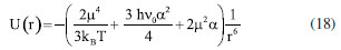 O primeiro, segundo e terceiro termo do lado direito da equação retratam as interações do tipo dipolo-dipolo, forças de dispersão (dipolo induzido-dipolo induzido) e forças de indução (dipolo-dipolo induzido), respectivamente.25 O segundo termo é significativo na análise de moléculas apolares e a identificação de polaridade depende da eletronegatividade.9 Um dipolo instantâneo pode se formar em uma molécula distorcendo a nuvem eletrônica de outra molécula próxima. Um novo rearranjo desse dipolo instantâneo provoca, novamente, uma reorientação dos dipolos formados no sistema molecular vizinho, gerando uma atração entre ambas. A essas interações se dá o nome de interações de London.9 As interações de London dependem da polarizabilidade. Essa propriedade indica a facilidade de deformação de uma nuvem eletrônica sob aproximação de um campo elétrico. Um átomo com alta capacidade de ser polarizável é aquele com um significativo número de elétrons, o que lhe confere um caráter volumoso e uma maior dificuldade dos elétrons mais externos em interagirem com a carga nuclear efetiva.9 Desse modo, as moléculas com átomos facilmente polarizáveis apresentam um número de elétrons apreciável para distorção, fortalecendo as interações de London.9 A energia que descreve as interações de London depende da polarizabilidade e da distância - conforme o termo apontado. Assim, ao analisar as moléculas do tipo X2 se nota que o maior número de elétrons em cada elemento químico aumenta a polarizabilidade e, consequentemente, as interações de London são mais fortes resultando em maiores temperaturas de fusão e ebulição.