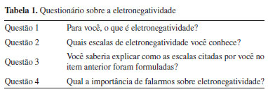 Por fim, um questionário seria disponibilizado aos alunos para que respondessem, em sala de aula, algumas questões, conforme se encontram na Tabela 1. O questionário direcionado ao diagnóstico de como a propriedade eletronegatividade é compreendida pelos estudantes segue um formato de questões do tipo abertas a fim de dar ampla liberdade ao respondente na descrição das respostas.22 O questionário contém quatro questões ordenadas de forma sequencial em que uma questão é conectada à antecessora. Tais questões são dissertativas, permitindo que os estudantes expliquem com as próprias palavras e de forma livre o que compreendem sobre o assunto.