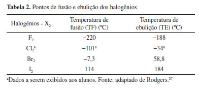 Uma tabela com dados de temperatura de fusão (TF) e ebulição (TE) das moléculas F2, Cl2, Br2 e I2 é exibida, conforme a Tabela 2. Podem ser elaborados gráficos, desenhos, fluxogramas que expliquem a associação da polarizabilidade, polaridade, eletronegatividade, raios atômicos e número de elétrons. Já a expressão do teste pode ser feita de modo verbal. Sugere-se o uso da plataforma Avogadro,26 de licença gratuita para uso, para o desenho das moléculas e visualização do mapa de potencial eletrostático. Essas representações facilitam a compreensão de nível abstrato e promovem o manejo com modelos. A atividade de modelagem deverá ser feita em grupos.