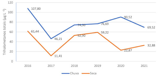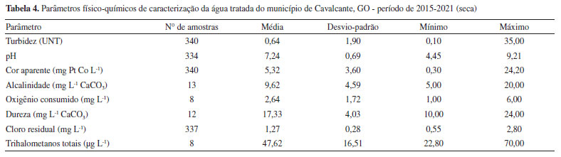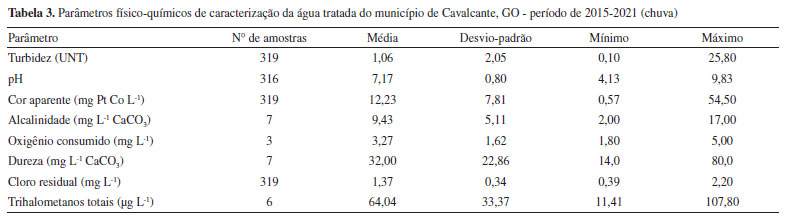 Oliveira et al.,14 avaliaram a eficiência de 20 estações de tratamento, considerando os resultados de cor e turbidez. O estudo evidenciou que as estações apresentaram melhor desempenho no período de seca, e apenas uma estação obteve a meta de 95% das amostras com turbidez < 0,5 UNT. As três estações de tratamento de água com os piores índices de atendimento à meta de turbidez, todas operavam com sobrecarga e tais condições parecem interferir no desempenho das estações de menor porte, localizadas em pequenos municípios onde a operação tenderia a ser menos acurada. Vale ressaltar que a ETA de Cavalcante foi projetada em 1990 para tratar uma vazão afluente de 7,5 L s-1 e atualmente recebe uma vazão de 15 L s-1. Para cor aparente o valor máximo permitido (VMP) determinado pela Portaria do Ministério da Saúde No. 888 de 202110 é de 15 mg Pt Co L-1, e de acordo com as Tabelas 3 e 4 o valor médio, no período estudado, foi de 8,78 mg Pt Co L-1. Os resultados não conformes representaram 10% das amostras analisadas. A cor aparente média no período chuvoso (12,23 mg Pt Co L-1) teve aumento percentual de 56% quando comparada ao período de seca (5,32 mg Pt Co L-1). No que se refere à concentração de oxigênio consumido não houve redução do valor desse parâmetro quando comparado à água bruta (Tabelas 1 e 2) e água tratada (Tabelas 3 e 4), considerando sua correlação com a concentração de matéria orgânica na água, pode-se inferir que o tratamento não está apresentando boa eficiência para remoção de material orgânico dissolvido. Em seus estudos, Guerra et al.,22 evidenciaram que a incorporação da pré-oxidação com peróxido de hidrogênio nos processos de purificação é uma alternativa viável para a remoção de matéria orgânica não húmica ou hidrofílica, de difícil remoção por processos convencionais; e principal responsável pela formação de subprodutos da desinfecção como os THMs. A etapa de desinfecção é um processo que usa um agente químico ou não químico e que tem por objetivo a inativação de micro-organismos patogênicos presentes na água, incluindo bactérias, protozoários e vírus.23 Na ETA de Cavalcante é utilizado cloro gasoso para o processo de desinfecção, mantendo o cloro residual livre na saída do tanque de contato entre 0,2 e 2,0 mg L-1. Para controle da eficiência da desinfecção é realizado o monitoramento de coliformes totais e Escherichia coli na água tratada, conforme orientações da Portaria de Potabilidade. A presença destes micro-organismos são indicadores de contaminação com fezes humanas e/ou esgoto sanitário. Durante o período de amostragem em 100% (659) das amostras de água tratada avaliadas não foram detectadas a presença de Escherichia coli e coliformes totais, o que corrobora com um processo de desinfecção eficiente. Embora a cloração da água potável forneça muitas vantagens, os THMs continuam a ser uma preocupação para a saúde humana. A correlação entre a concentração de cloro residual livre e a formação de THMs é dada por Delpha e Rodriguez,24 os quais mencionam que "quanto maior a dosagem de cloro, maior será a probabilidade de formação de THMs em uma dada massa de água que abrigue seus precursores orgânicos". Dados estes que foram observados na ETA de Cavalcante, onde o consumo de cloro foi 35% maior durante o período chuvoso, e como pode ser observada na Figura 3, em todas as amostras analisadas a concentração de THMs foi superior durante as chuvas.
