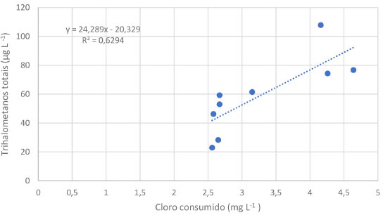 O cloro é aplicado na água tratada com o objetivo de destruição de micro-organismos (desinfecção). No entanto, devido ao seu alto poder oxidante, quando há contato entre o cloro e a matéria orgânica presente, a oxidação desta se inicia e em consequência à reação de formação dos THMs, e esta irá continuar enquanto houver reagente disponível (cloro e/ou material orgânico).23 Cloro consumido é a medida de cloro que foi consumido durante o processo de desinfecção, medido pela diferença entre o cloro dosado e o cloro residual na saída do tanque de contato. A correlação de Pearson forte (R 0,79) entre o cloro consumido e a formação de THMs demonstra claramente o impacto da ação oxidante do cloro sobre a formação de subprodutos da desinfecção. Sobre correlações lineares, Serajuddin et al.29 afirmaram que as mesmas com valores de R2 acima de 0,45 são moderadas e adequados para avaliações rápidas. Na Figura 4 pode ser visualizado o R2 e a equação da reta do monitoramento trihalometanos versus cloro consumido.