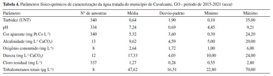 Segundo Libânio,17 a cor verdadeira é produzida pela reflexão da luz em partículas minúsculas denominadas coloides, finamente dispersas e de dimensão inferior a 10 µm, de origem predominantemente orgânica. A cor está normalmente associada à presença de ácidos húmicos e taninos, originados da decomposição de compostos orgânicos naturais, oriundos da degradação de plantas e animais. Neste estudo foi avaliado o parâmetro cor aparente, que se difere da cor verdadeira por sofrer influência de partículas suspensas na amostra. Para avaliação da cor verdadeira é necessário centrifugar a amostra e remover os sólidos suspensos totais, no entanto, a cor aparente é muita utilizada na rotina de monitoramento das estações de tratamento de água. Sendo assim, a cor aparente média do período em estudo foi de 15,70 mg Pt Co L-1, com valores máximos no período chuvoso, chegando a 41,00 mg Pt Co L-1. Corpos d'água de cor naturalmente escura ocorrem em regiões ricas em vegetação e, consequentemente, de solos menos erodíveis. Assim como os valores de cor se correlacionam com a concentração de carbono orgânico dissolvido presente no ambiente aquático, o oxigênio consumido (OC) é outro importante indicador, que se baseia na concentração de oxigênio requerido para a oxidação da matéria orgânica biodegradável e não biodegradável. Muito útil para avaliar alterações de qualidade na água a ser tratada, e indicar a efetividade do processo do tratamento aplicado à água.18 Analisando as Tabelas 1 e 2, observa-se que as amostras estudadas apresentam níveis de OC abaixo de 5,00 mg L-1, com valor máximo observado no período de seca de 6,80 mg L-1. A alcalinidade da água é representada pela presença dos íons hidroxila, carbonato e bicarbonato, e juntamente com o pH, assumem importante papel no processo de coagulação e eficiência do tratamento. Durante o período da pesquisa, o valor de pH foi de 6,60 e a alcalinidade natural variou de 2,00 a 42,00 mg L-1 de CaCO3. A resolução CONAMA No. 357,15 estabelece a faixa de pH entre 6 a 9 e de acordo com a FUNASA16 a maioria das águas naturais apresentam valores de alcalinidade na faixa de 30 a 500 mg L-1 de CaCO3, caracterizando a água bruta de Cavalcante, GO, como água de baixa alcalinidade. A dureza é um parâmetro químico que indica a concentração de cátions multivalentes em solução na água, sobretudo de cálcio (Ca+2) e magnésio (Mg+2), podendo ser de origem natural por contato da água com o solo. A dureza média, no período estudado, foi de 15,01 mg L-1 CaCO3 e máxima de 32,00 mg L-1 CaCO3, classificando a água do manancial, segundo Richter,19 como mole ou branda (< 50 mg L-1 de CaCO3). Águas com dureza > 180 mg L-1 de CaCO3 podem apresentar sabor desagradável e causar incrustações na rede de distribuição. Em seus estudos, Oliveira et al.,2 verificaram uma correlação positiva e diretamente proporcional entre a dureza e a formação de THMs. Navalon et al.20 demonstraram, em seus estudos, que os íons Ca2+ e Mg2+ podem contribuir para o aumento da formação de THMs. Essa constatação foi verificada por meio de ensaios, onde os autores adicionaram diferentes concentrações de cálcio e magnésio e observaram o aumento proporcional a estes, na formação de THMs. Portanto, a presença dos íons de cálcio e magnésio pode favorecer a reação de formação de THMs. Caracterização da água tratada A tecnologia de tratamento utilizada na ETA de Cavalcante é do tipo dupla filtração, englobando as etapas de coagulação, seguida de filtração ascendente e descendente, desinfecção, fluoretação e correção do valor de pH. De acordo com Kawamura21 a dupla filtração é indicada para águas com turbidez < 50 UNT, cor aparente < 50 mg Pt Co L-1 e Escherichia coli < 103 NMP 100 mL-1, o que corrobora com os resultados de água bruta do manancial estudado, que apresentou concentração média de Escherichia coli 193 NMP 100 mL-1, turbidez máxima 19,70 UNT e cor aparente máxima 42,00 mg Pt Co L-1 (Tabelas 1 e 2). Segundo os resultados das análises de água bruta o manancial pode ser classificado como Classe 1, conforme resolução CONAMA No. 357 de 2005.15 A nova Portaria de Potabilidade No. 888 de 2021 do Ministério da Saúde10 estabelece que após filtração rápida (tratamento completo ou filtração direta) deve-se obter em 95% das amostras o valor máximo permitido (VMP) de 0,5 UNT para turbidez. Entre as 659 amostras analisadas, 43% apresentaram valores superiores a 0,5 UNT, e os maiores índices de não conformidades foram registrados no período chuvoso (Tabelas 3 e 4).