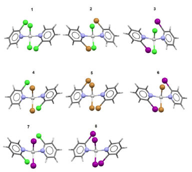 ![]() Figura 1. Representações estruturais dos complexos orto-substituídos de Zn2+ (complexos de 1 a 8) geradas a partir dos arquivos CIF correspondentes (números CCDC apresentados no rodapé da Tabela 1). Azul: nitrogênio; verde: cloro; amarelo: bromo; rosa: iodo; cinza-escuro: carbono; cinza-claro: hidrogênio; branco: Zn2+