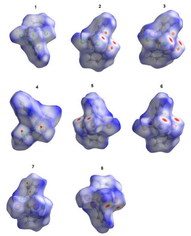 ![]() Figura 2. Superfícies de Hirshfeld na função dnorm para os complexos de 1 a 8