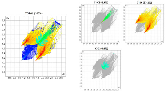 As Figuras 3, 4 e 5 mostram os gráficos de impressão digital para os complexos 1, 2 e 3, respectivamente, onde as LX são representadas na cor verde e aparecem como uma "linha" quando X = Y ou como "asas" quando X ≠ Y. 27 Isso ocorre devido à natureza pseudo-espelhada destes gráficos,28 ou seja, quando X = Y temos apenas contatos do tipo Cl···Cl na superfície (complexo 1) e quando X ≠ Y os contatos são do tipo X···Y/Y···X (complexos 2 e 3). Os contatos mais próximos observados nos gráficos, com valores de de + di próximos de 3,6 Å (complexo 1), 3,5 Å (complexo 2) e 3,4 Å (complexo 3) acompanham o aumento da polarizabilidade de X e consequente aumento das áreas em vermelho nas superfícies de Hirshfeld e estão de acordo com os dados cristalográficos listados na Tabela 1S. A porcentagem de contribuição das interações X···Y nas superfícies de Hirshfeld aumenta com o aumento da polarizabilidade de X, sendo os valores encontrados de 4,3, 4,6 e 5,7% para os complexos 1, 2 e 3, respectivamente, como indicado nos gráficos decompostos nas Figuras 3-5. Na Tabela 2S estão listadas todas as contribuições relativas das interações não-covalentes para a superfície de Hirshfeld para todos os complexos orto-substituídos.