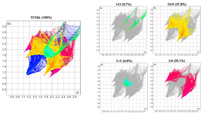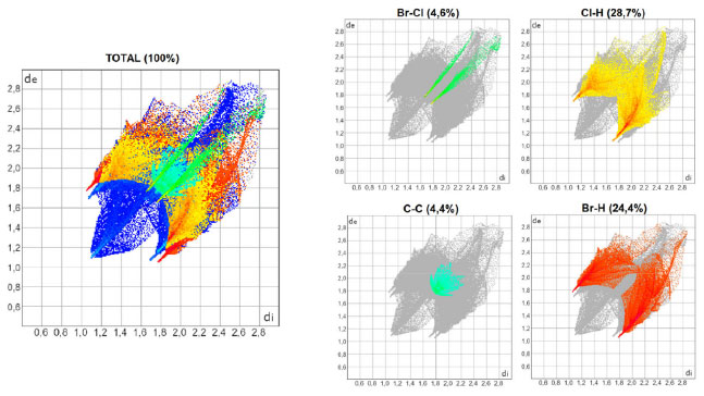 O software CrystalExplorer 21.5®14 foi empregado para o cálculo das superfícies de Hirshfeld (função dnorm e shape index) e dos gráficos bidimensionais de impressão digital. As superfícies de Hirshfeld foram mapeadas entre o azul (maiores distâncias) e o vermelho (menores distâncias). Os gráficos bidimensionais foram mapeados entre 0,4 e 3,0 Å para cada par de distâncias de e di. As cores dos gráficos bidimensionais foram modificadas com o auxílio do software GIMP 2.10.24®22 para uma melhor distinção das diferentes interações não-covalentes. O software VESTA®23 foi usado para a medida das distâncias das ligações não-covalentes a partir das informações cristalogáficas dos arquivos CIF e os valores foram comparados com a soma dos raios de van der Waals para os halogênios.24