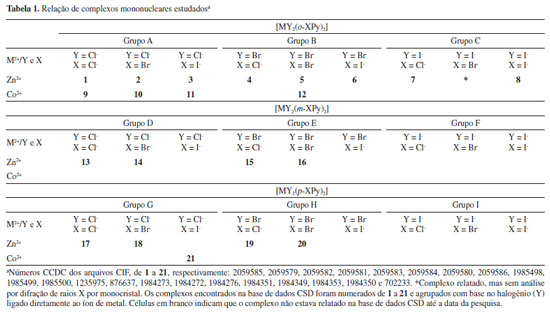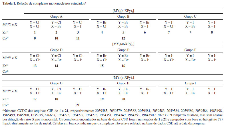 METODOLOGIA COMPUTACIONAL O estudo foi delineado por uma pesquisa minuciosa na base de dados Cambridge Structural Database (CSD) por complexos mononucleares do tipo [MY2(o-XPy)2] (Figura 1S), [MY2(m-XPy)2] (Figura 12S) e [MY2(p-XPy)2] (Figura 18S), onde M = Zn2+ ou Co2+, Y = Cl−, Br− ou I− e Py = ligante piridínico monosubstituído em orto-, meta- ou para- por X, sendo X = Cl−, Br− ou I−. Foram encontradas 21 estruturas, que foram numeradas e separadas em grupos (A, B ou C) em função do átomo de halogênio Y (Tabela 1).