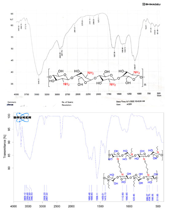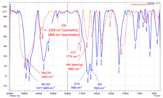 ![]() Figure 2. FTIR spectrum of hydroxyurea (blue), hydroxyurea embedded in the cross-linked chitosan matrix (red)