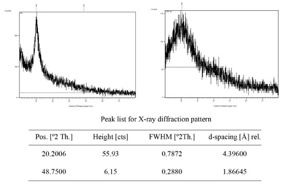 ![]() Figure 3. X-ray diffraction pattern of the cross-linked chitosan (left), and HU embedded in the chitosan matrix (right)