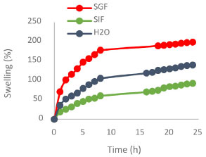 CONCLUSION The partially cross-linked chitosan with glutaraldehyde formed a hydrogel polymer with H2O. The highest swelling ratio obtained was 200%. The measured degree of H2O absorption depended on the degree of cross-linking. The formed hydrogel was highly compatible with HU. The rate of HU release was found to vary with the swelling rate. The rate of HU release was higher under acidic conditions, and the rate was in the following order in different media; SGF > deionized water > SIF.