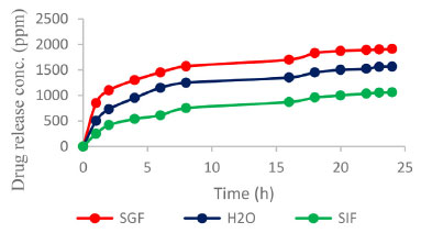 ![]() Figure 6. Release of HU from the cross-linked chitosan matrix in SGF, SIF and water media