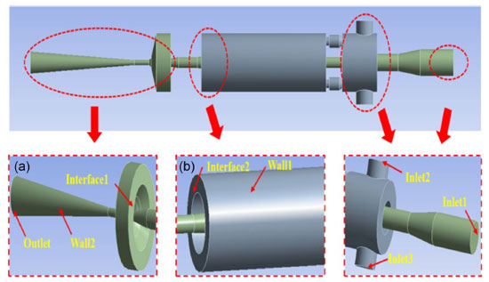 Boundary condition According to the basic condition of the jet pump, the boundary of the geometric model established above is set. As can be seen from Figure 2, there are 8 boundaries on the model, including 3 entrance boundaries (Inlet1, Inlet2, Inlet3), 1 exit boundary (Outlet), 2 interfaces (Interface1, Interface2), and 2 wall boundaries (Wall1, Wall2). In the simulation, the two interfaces are in contact. Wall1 refers to all remaining surfaces in the geometric model not defined in Figure 2b, and Wall2 refers to all remaining surfaces not defined in the geometric model shown in Figure 2a.