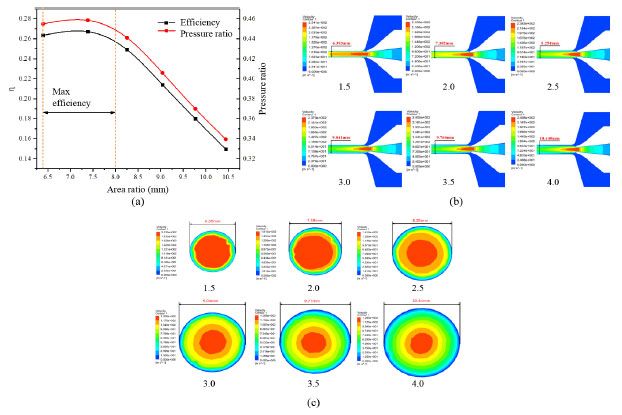 Figure 3b is a velocity cloud view of the spout outlet to the duct inlet in the flux pump. The highest velocity at the spout outlet always fluctuates between 239 and 247 m s-1, and the region of the highest fluid velocity (red region) decreases as the spout distance gradually decreases. When the duct distance is equal to 3 times, it is obvious that only a small part of the high-speed fluid entered the duct. This is because the gradual increase of spout distance makes the effective distance of the suction fluid longer, and the velocity decreases significantly before the fluid enters the duct. Figure 3c shows the flow field diagram from the outlet of the jet pump spout to the inlet of the duct. When the duct distance is 2.61 mm (0.5) and 5.22 mm (1.0), the suction fluid can enter completely into the duct of the jet pump, and the suction fluid forms a wall flow layer at the inlet section of the duct. Furthermore, with the gradual increase of spout distance, the reflux area (red dashed circle) appeared in the inhalation chamber, and the size of the reflux area gradually increased with the increase of spout distance. Finally, the reflux area is very obvious when the duct distance is 15.66 mm (3.0). This is because of the gradual increase of the product distance, the dynamic fluid from the spout jet diverges before entering the duct so that part of the inhalation fluid cannot be carried into the duct, and then the reflux area appears in the inhalation room. Effect of area ratio on the pump efficiency of jet pump As shown in Figure 4a, when the duct diameter ranges from 6.393 (area ratio 1.5) to 7.382 mm (area ratio 2), the pump efficiency gradually increases with the duct diameter increase. However, when the area ratio is greater than 2, the pump efficiency gradually decreases as the duct diameter increases. Therefore, it can be determined that the duct diameter of the maximum pump efficiency is between 6.393 and 8 mm, and the pressure ratio curve has the same trend as the pump efficiency.