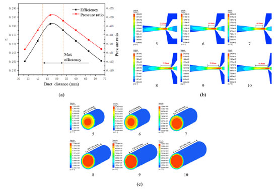 Figure 4b shows a picture of the jet pump's internal velocity cloud at different duct diameters. When the duct diameter is 6.393 mm (area ratio 1.5), the fluid flow rate in the duct is gradually reduced, and the difference between the inlet and the outlet is about 26 m s−1, so the flow rate is low. However, as duct diameter gradually increases (area ratio increases), the decreasing amplitude of the flow velocity in the duct gradually increases. When the duct diameter is 10.440 mm (area ratio 4.0), the difference between the inlet and the outlet flow rate is about 144 m s−1. This is due to the gradual increase in the area ratio. The flow core area of the dynamic fluid decreases, and the contact area between the dynamic fluid and the suction liquid increases so that the flow rate of the mixture is significantly reduced. Figure 4c shows a cloud view of the velocity at the duct outlet at different duct diameters in the jet pump. When the duct diameter is 6.39 mm, the maximum velocity at the outlet is about 204 m s-1, and this velocity region is large. However, with the gradual increase of duct diameter, the maximum velocity at the duct outlet gradually decreases, and when the area ratio gradually increases, the highest velocity area gradually decreases. It can be seen that the maximum velocity at the duct outlet and the area size of the highest velocity gradually decrease with the increase of duct diameter. This is because, with the increase of the area ratio, the section at the duct outlet is larger, so the contact area between the dynamic fluid and the suction fluid in the duct also increases. Thus, the two have sufficient energy transfer in the duct, so the highest speed and maximum speed areas gradually decrease as the area ratio increases. Effect of duct distance on the pump efficiency of jet pump As shown in Figure 5a, when the duct aspect ratio is between 5 and 7, the pump efficiency gradually increases with the increase of the aspect ratio. However, when the aspect ratio is greater than 7, the pump efficiency gradually decreases with the increase of the aspect ratio. Therefore, the duct distance interval can determine the maximum pump efficiency between 42.5 (duct aspect ratio 6.39) and 53.2 mm (duct effect aspect ratio 8). With the increase of the duct distance, the pressure ratio curve shows the same trend as the pump efficiency.