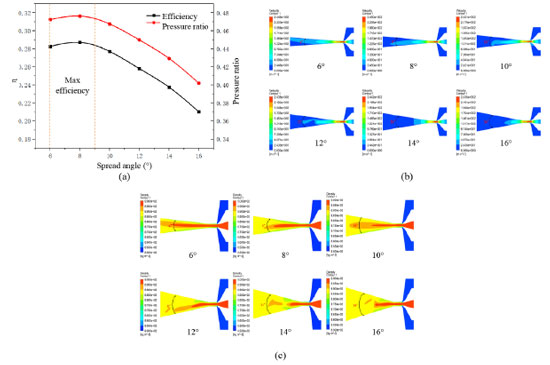 Figure 5b plots the velocity cloud within the duct at different duct distances in the jet pump. With increasing duct distance (aspect ratio), the maximum velocity within the duct always fluctuates between 243 and 246 m s−1, and the region size of the highest velocity is almost the same. Although the duct outlet velocity fluctuates between 194 and 197 m s−1, the region of the export velocity increases with duct distance. This is because the dynamic fluid and the inhalation fluid have been fully mixed in the duct, and the diameter does not change. Even if the duct distance increases again, the flow rate of the mixture does not change much, but the flow rate region will increase with the increase of duct distance. Figure 5c shows a diagram of the velocity cloud at the duct outlet at different duct distances in the jet pump. When the duct distance is 33.25 mm, the maximum velocity at the outlet is about 134 m s−1, and this velocity region is small. However, as the duct distance gradually increases, the maximum velocity at the duct outlet also gradually decreases, and when the aspect ratio gradually increases, the highest velocity area gradually increases. This is due to the increase of the aspect ratio; the contact time between the dynamic fluid and the suction liquid in the product becomes longer so that the dynamic fluid and the suction liquid have full energy transfer, and the maximum velocity area gradually increases with the increase of the aspect ratio. Effect of spread angle on the pump efficiency of jet pump As shown in Figure 6a, when the spread angle is between 6 and 8°, the pump efficiency gradually increases with increasing spread angle. However, when the spread angle is greater than 8°, the pump efficiency decreases gradually with the increase of the spread angle. Thus, it can be determined that the spread angle interval for maximal pump efficacy is between 6 and 9°. Moreover, with the spread angle increase, the pressure ratio curve shows the same trend as the pump efficiency.