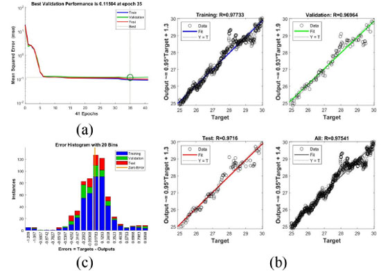 BP neural network A BP neural network model consists of some nodes/neurons, which are set at multiple layers: the input layer, one or more hidden layers and output layer. Each node/neuron has an activation function, which calculates how much neuron is "stimulated". At each layer, the collections of nodes/neurons transform the input parameters, these parameters are distributed to the next layer, which is described as Equations 5, 6 and 7: ![]() where x represents the input to the first layer, z represents the first layer's output, i and j represent the neural network node index, wji(l) represents the weight between the jth node in the ith layer and the ith node in the (i + 1)th layer, F(ain) represents the output value of ith node in (n + 1)th layer after being activated by the activation function, w and w0 represent the weight and bias between the neurons, which measures the significance of the data passed along the link (synapse). F(a) represents the activation function, which employs the hidden layer's aggregated output to calculates the output y. The initial weights and biases randomly assigned, the training process continues until the desired output is obtained, which is evaluated by the cost function (Equation 8): ![]() where y represents the output, t represents the desired output. Levenberg-Marquardt (LM) algorithm is utilized in the neural network training process, which is a variation of gradient descent. The weight and bias of the neural network model are changed during the training process to minimize the error, which is described as Equation 9: ![]() where The Levenberg-Marquardt algorithm starts with a forward computation by Equations 5, 6 and 7. The prediction errors of the output layer and the hidden layer are calculated by Equations 10, 11 and 12: ![]() As shown in Equations 13 and 14, the Jacobian is calculated by a back-propagation process: ![]() In the training process of the sample, the learning sample should be processed to make it fluctuate in a certain range. The normalization method is adopted in this paper to process the data to ensure that the data is between 0 and 1, which is written as Equation 15: ![]() where x̄i represents the average value, xmax represents the maximum value, xmin represents the minimum value. In this paper, the Levenberg-Marquardt back propagation is employed to enhance the model training rate related to pure error back propagation or steepest descent, and this algorithm maintains the accuracy of the trained model. The neural network regression model is trained with the designed model structure, input parameters, and the number of nodes. The accuracy of both the training and the prediction/estimation is evaluated by mean absolute error (MSE), which is written as Equation 16: ![]() where eavg represents the average absolute error, n represents the number of data points, Outputk represents the kth estimated output parameter, and Outputr,k represents the kth reference output parameter.