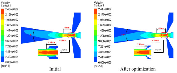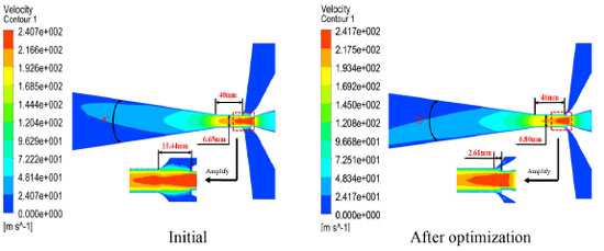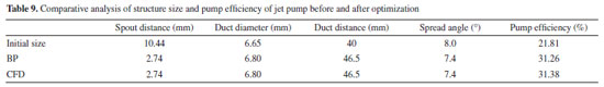 Comparison of jet pump performance before and after size optimization As shown in Figure 8, by comparing the cross-section velocity cloud map of the jet pump before and after optimization, it is found that the maximum velocity of the fluid in the optimized jet pump is almost the same. Because the duct distance before the optimization is much larger than after optimization, the effective action distance of the suction fluid carried by the dynamic fluid becomes longer. Only a small part of the high-speed fluid (red area) enters the duct in the jet pump before optimization. Although the spread angle before and after optimization is similar, the mixed liquid can be fully developed for the whole section. By combining the analysis of the data in Table 9 and Figure 8, it proves that the optimized jet pump improves the performance compared with the initial jet pump and further shows that the method in this paper has a good ability to optimize the structural size of the jet pump and improve the pump efficiency.