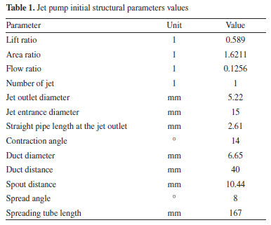 METHODOLOGY Mathematical model For the working process of the jet pump, the fluid is usually described by the following basic control equations. Continuity equation ![]() The physical meaning of the equation is that: in unit time, the mass difference of the inflow and the mass change of the outflow are equal to zero when the fluid passes through the unit volume. For an incompressible fluid, due to the density ρ that is constant, the continuity equation can be expressed as follows: ![]() The momentum conservation equation (Navi-Stokes equation): ![]() where, p0 is static pressure (Pa), τij (i j can be taken as, x y, and z, respectively) is the tensor of stress (Pa), fk (k can be taken as, x, y, and z, respectively) is volume force of gravity (N m−3). Realizable k-ε model The jet pump in this paper is a typical turbulence model, in which the equations can be expressed as: ![]() where, Sij is time-averaged strain rate (s−1), S is the tensor modulus of the average strain rate. Physical model The structure of the jet pump is shown in Figure 1 and the initial structural parameters of jet pump are shown in Table 1.