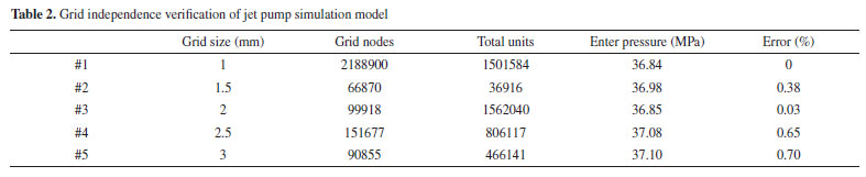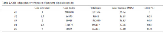 Inlet flow rate of the inhalation fluid is 1.85 kg s−1, and the outlet pressure of the jet pump is 22.45 MPa. Therefore, Inlet1 is finally set as the mass flow inlet boundary of the power fluid, and the value is 4.9 kg s−1. The Inlet2 and Inlet3 are set as the mass flow inlet boundary of the inhalation fluid, and the value is 0.6375 kg s−1. The outlet set as the pressure outlet boundary of the jet pump is 22.45 MPa. Grid-independent validation To further improve the calculation accuracy of CFD and effectively reduce the calculation time of the finite element simulation, the influence of different grid sizes on the simulation results is analyzed by changing the grid size of the geometric model. According to Table 2, five grid sizes are selected in this paper.