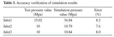 By comparing and analyzing the simulation results of different grid sizes, it is found that when the grid size in the model is 1-2 mm, the pressure value at the dynamic fluid inlet (Inlet1) is almost the same (the error is within 1%). The simulation results well verify the grid independence of the model. To reduce the operation time of the finite element simulation, the #3 grid division method with a grid size of 2 mm is selected for the simulation model of the jet pump. Accurate validation of the simulation results To verify the accuracy of the simulation results, the simulation pressure value of the dynamic fluid inlet (Inlet1) and the suction fluid inlet (Inlet2, Inlet3) are extracted to compare with the test data. As can be seen from Table 3, the difference between the simulation and the theoretical pressure (calculated from the basic characteristic equation of the jet pump)18 value at the dynamic fluid inlet is 2.82 MPa, and the relative error between the two is 8.3%. Moreover, the simulation pressure value at the inlet of the suction liquid is also very close to the theoretical pressure value, and the average relative error between the two is only 7.8%. Therefore, the simulation model has some accuracy within the allowable error limits.