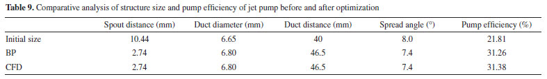 According to Table 8, 97104 (21 × 17 × 17 × 16) data combinations were obtained. The trained BP neural network model was used to predict the pump efficiency on 97104 data sets to complete the structural optimization of the jet pump. Table 9 shows the comparison of pump efficiency before and after size optimization. It can be seen from Table 9 that the calculated pump efficiency is very close to the predicted value of the BP neural network after optimization, which further proves the reliability of the BP neural network model. By comparing the specific structural dimensions of the two, the flow rate and the pump efficiency (obtained by numerical simulation), it can be found that the duct distance in the jet pump before the optimization is much larger than the optimized pump, and the former is about four times that of the latter. Comparing the duct diameter and duct distance in the jet pump before and after optimization shows that the optimized size is larger than before optimization. The difference between duct diameter and duct distance before and after optimization is 0.15 and 6.5 mm, respectively. In contrast, the spread angle is exactly the opposite, the optimized spread angle is smaller than before optimization, and the difference between the two is only 0.6. In addition, the pump efficiency was 21.81% (before optimization) and 31.26% (after optimization), respectively, and the pump efficiency was improved by 9.45%.